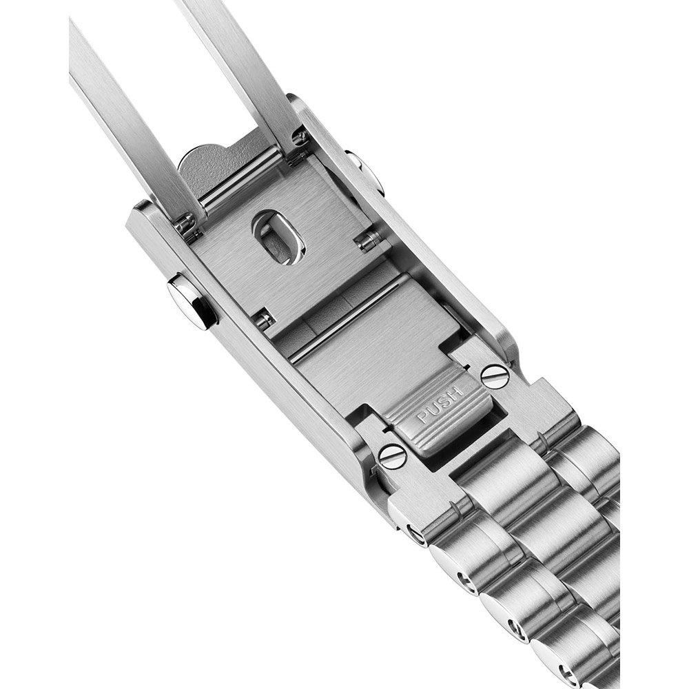 ポリッシュ仕上げとブラッシュ仕上げのアーチ型リンク5つで一列を構成するブレスレットが付属する、この42 mmのステンレススティール製ムーンウォッチは、フロントとケースバックにサファイアクリスタルガラスが採用されています。