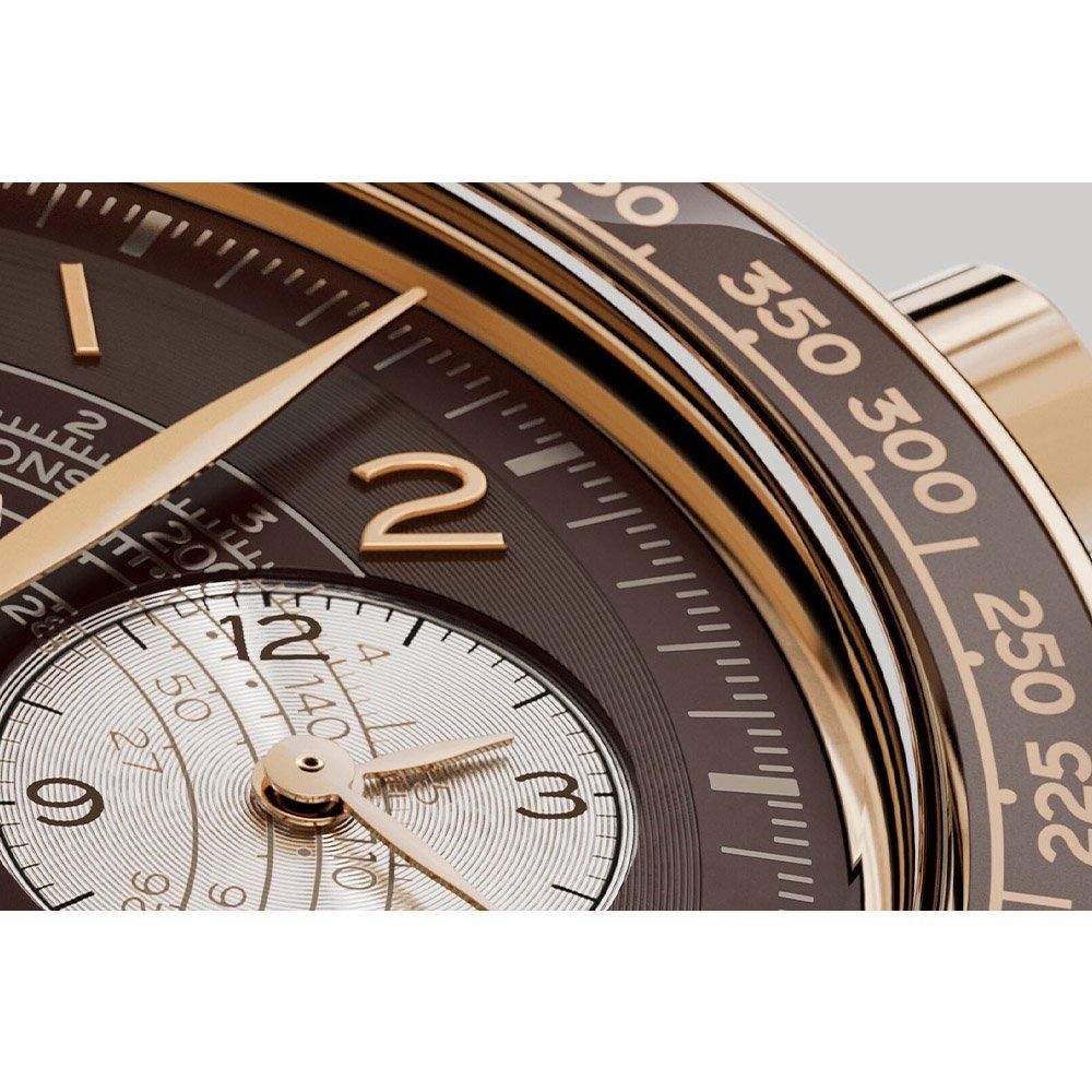 オメガ独自の金属であるブロンズゴールド製の43mmサイズのモデルで、美しい風合いをもつオパリン仕上げの酸化ブロンズ製の文字盤を備えています。“ヴィンテージ”エナメルのタキメータースケールが付いたポリッシュ仕上げのブラウンセラミック製ベゼルリングと、同じく18KブロンズゴールドのPVDコーティングが施されたリーフ型針、アラビア数字がセットされています。数字の下には、スパイラルを描くレーシングトラックパターンを見ることができます。