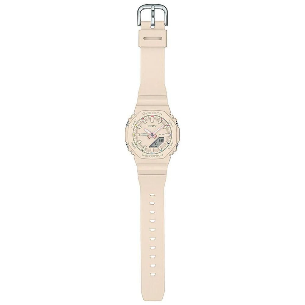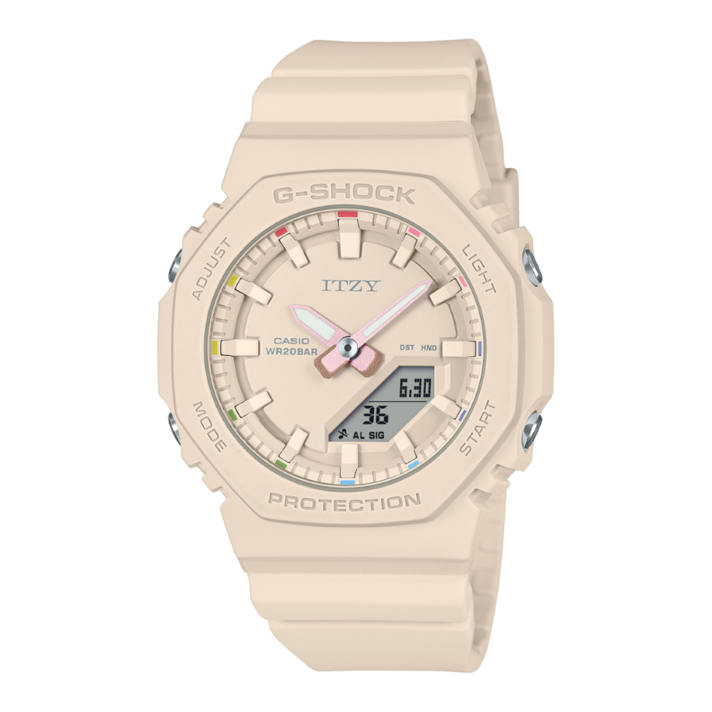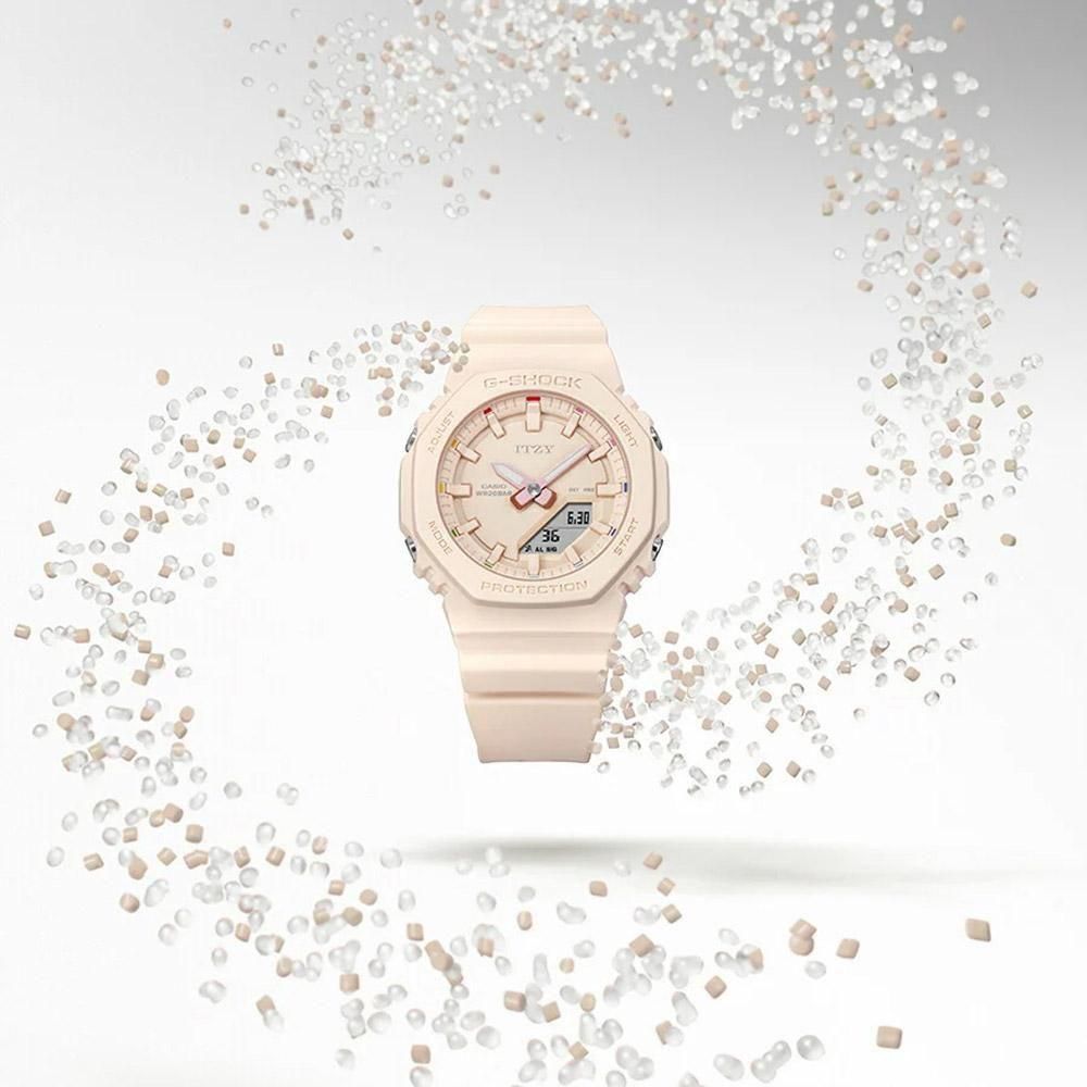 八角形ベゼルが特徴の「2100」シリーズの小型モデル「GMA-P2100」をベースとし、ベーシックなカラーリングを基調に「ITZY」のクールなイメージを時計で表現しています。ボディ全体はコーディネートに合わせやすいベージュピンク、ホワイト、スケルトンブラックを採用しながら、文字板のインデックス部分に公式ファングッズのライトリングをイメージしたマルチカラーをアクセントとして配しています。文字板や裏蓋にあしらわれた「ITZY」のロゴに加え、パッケージにはメンバーのプリントサインが入った特別仕様です。ベゼルやバンドにはバイオマスプラスチックを採用し、環境負荷低減にも配慮しました。