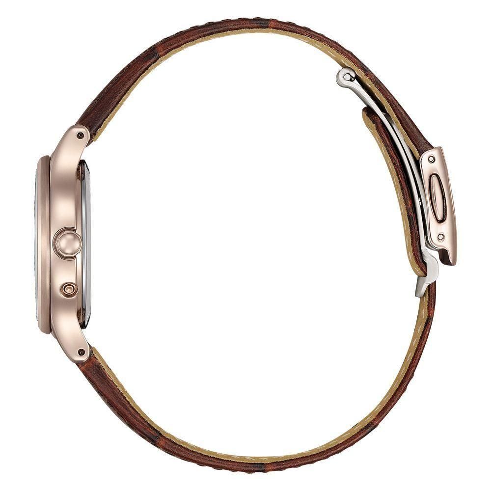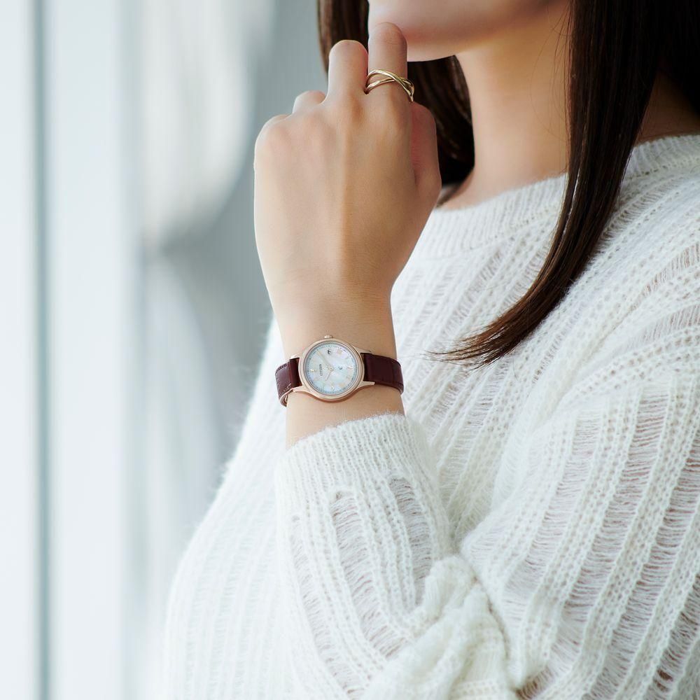 サクラピンク®のケースと革バンドが織りなす、シンプルで上品なデザイン。控えめながらも華やかな存在感が、手元に美しく映えるモデルです。光の環をイメージした、すっきりと細く艶やかなベゼルに差し込む光を表現したカットパーツをあしらった白蝶貝の文字板が、上品でさりげない輝きを添えます。