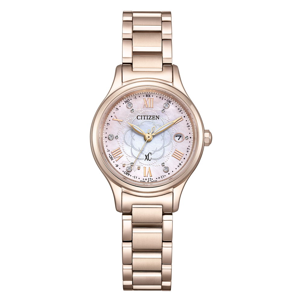 満開の美しいカメリア(椿)をモチーフにデザインした白蝶貝の文字板には、エッチングの花模様と“光の粒”が花びらに乗っているかのようなドットパターンを組み合わせ、愛らしさを表現しています。外周のピンクのグラデーションが、カメリアの華やかさと可愛らしさを引き立てています。