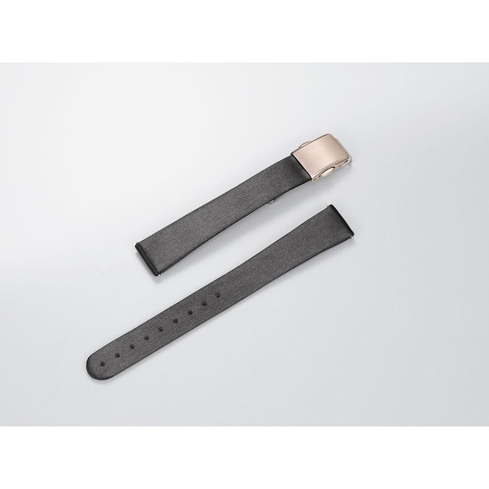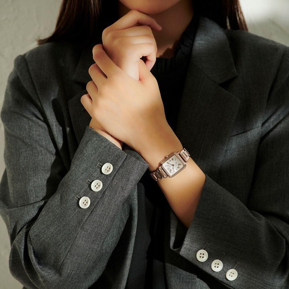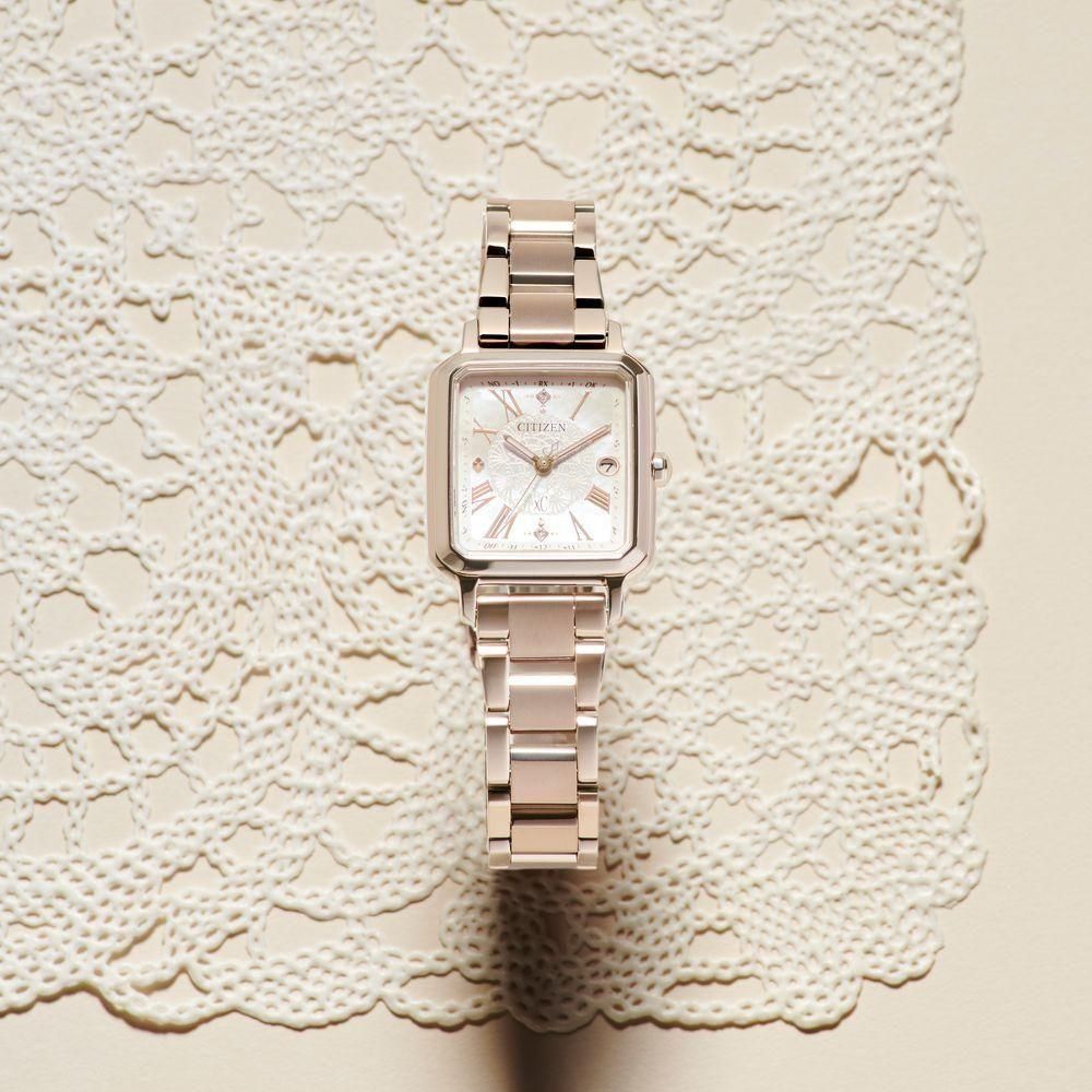 やさしくフェミニンな印象を与える、サクラピンク®のスクエアケースに、クラシカルで華やかな白蝶貝文字板を組み合わせたモデル。文字板にはほんのりとベージュカラーを重ね、中央には繊細なアンティークレースをモチーフにしたパターンをエッチングで描いています。12時と6時位置にはラボグロウン・ダイヤモンドをセッティング。ネックレスのような装飾が、さりげないアクセントとして輝きを添えます。ダークグレーのサテン調バンドをセットした2Way仕様で、気分やシーンに合わせて簡単にバンド交換ができるインターチェンジャブル構造を採用しています。