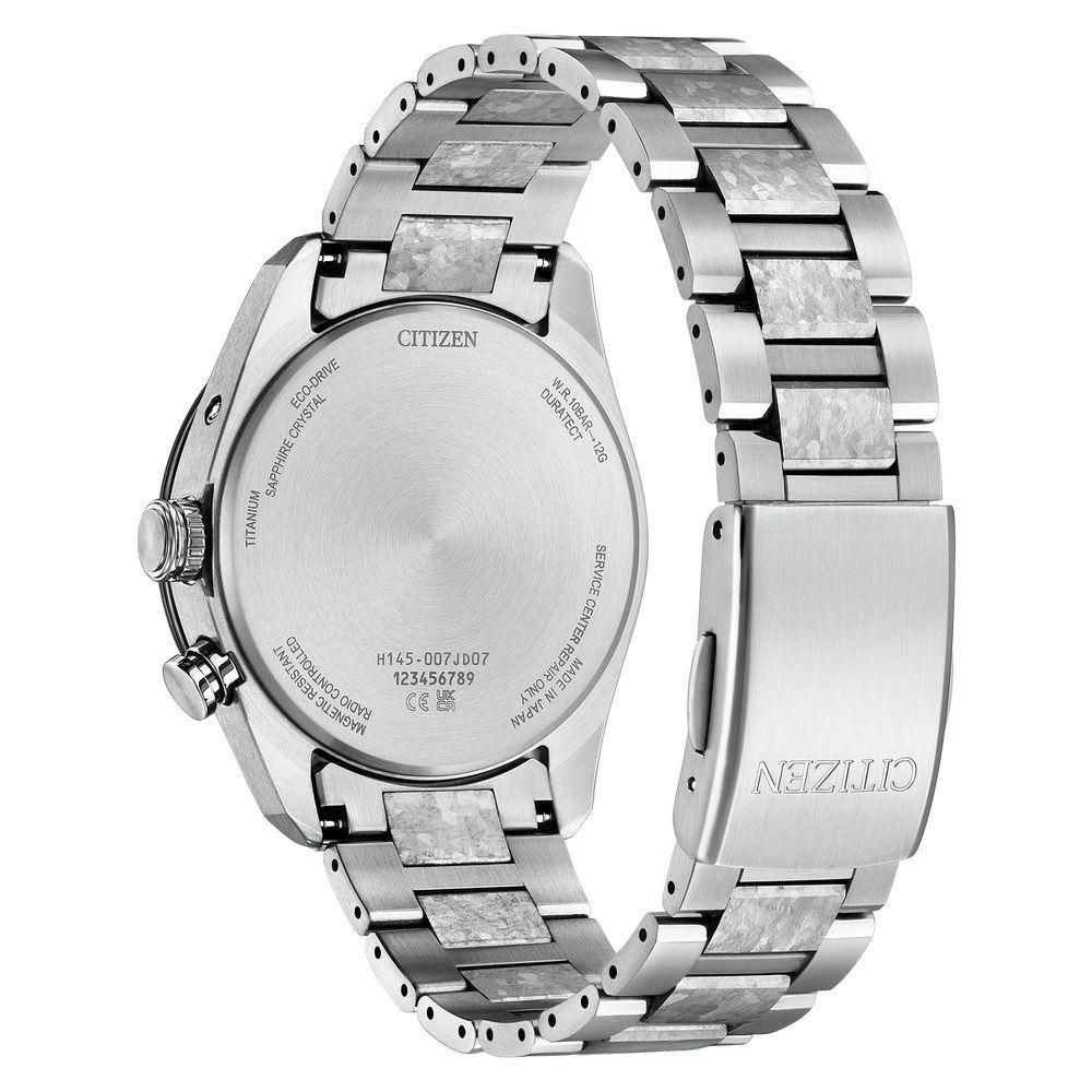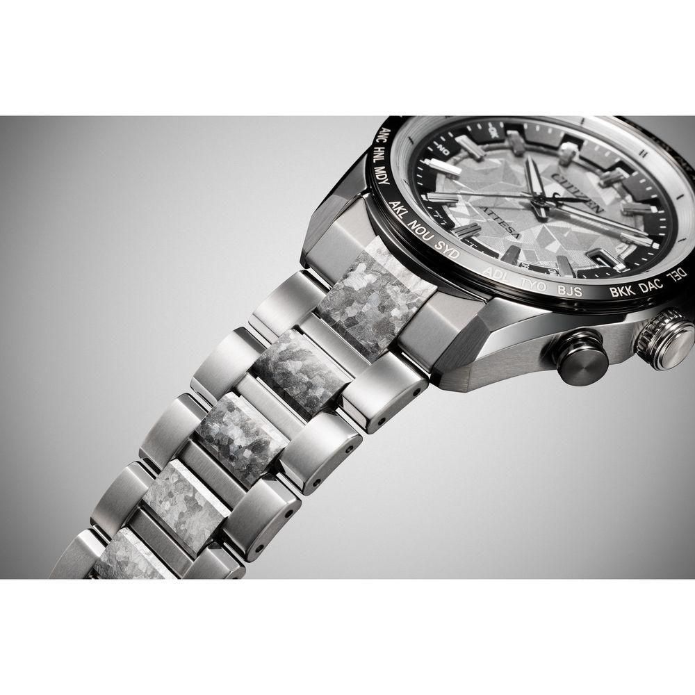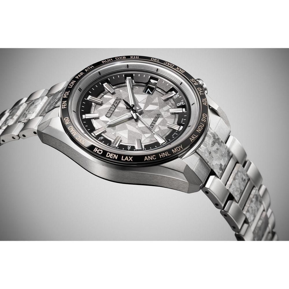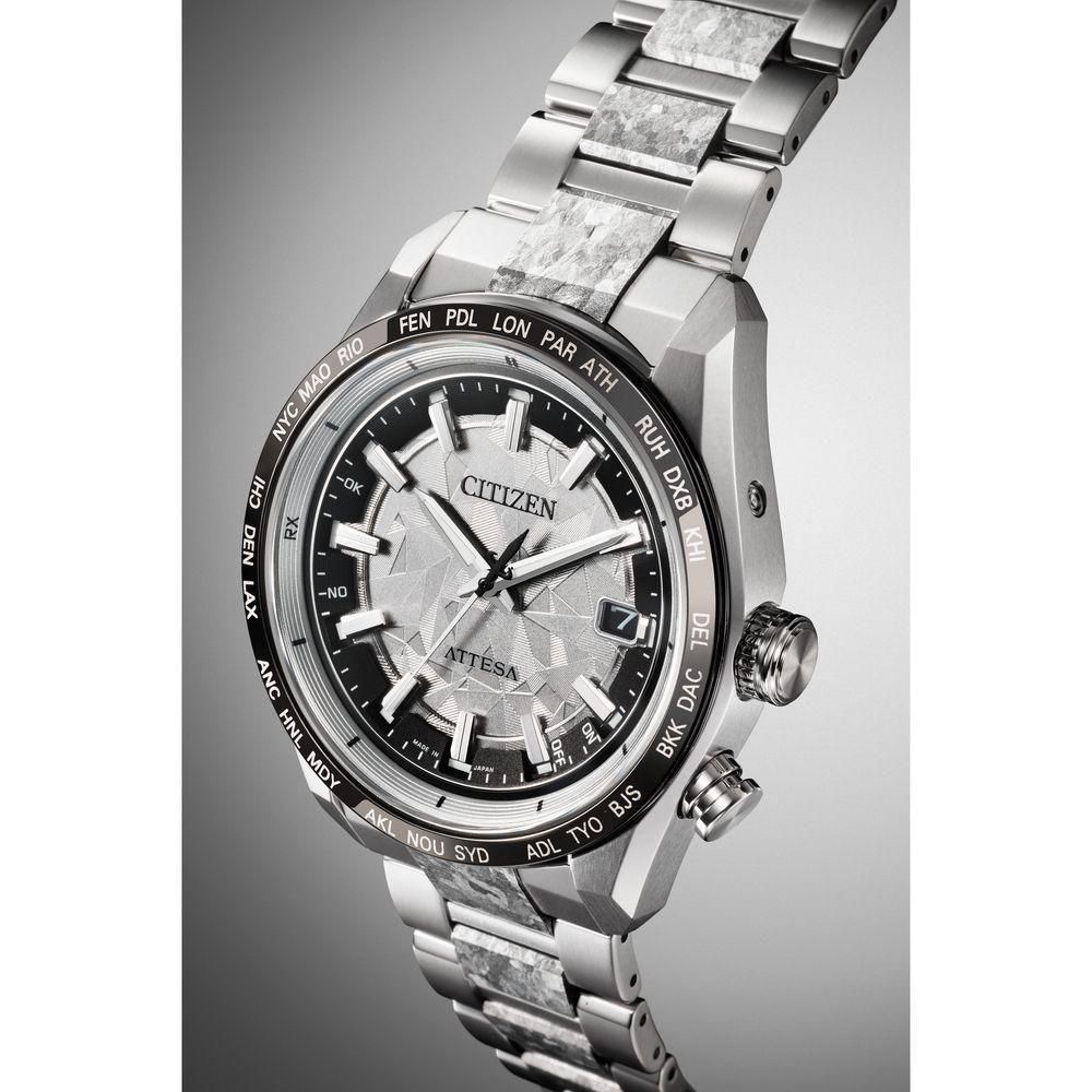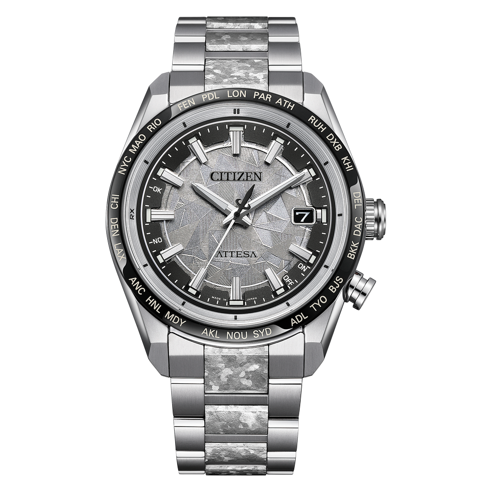 シチズン独自の技術で開発した結晶チタニウムを中駒に採用。デュラテクトプラチナを重ねることで結晶模様がプラチナの輝きをまとい、存在感を放ちます。シルバーの文字板は、結晶チタニウムをイメージしたデザインで、光に反射して表情を変えるメタリック塗装をプラス。見返しリングにも同様にメタリック塗装を施すことで、文字板や外装との一体感を演出しました。
