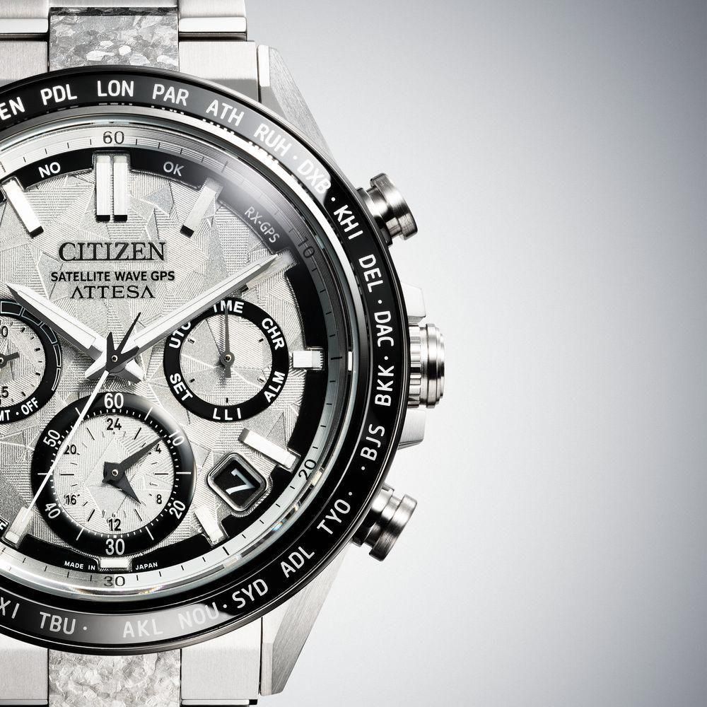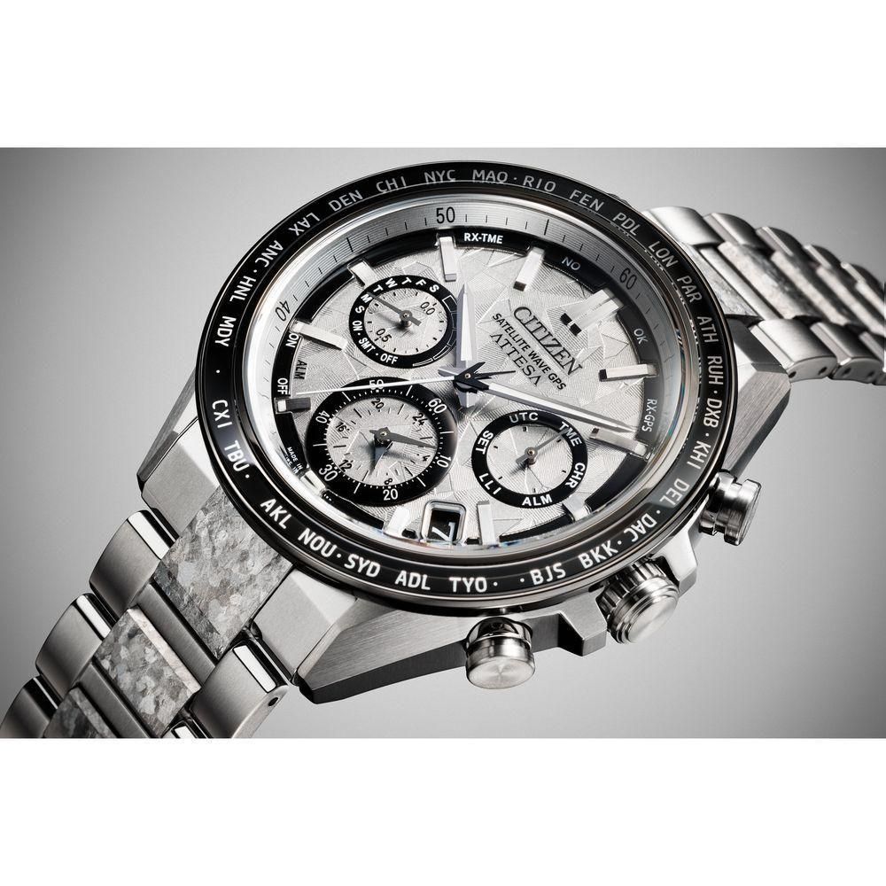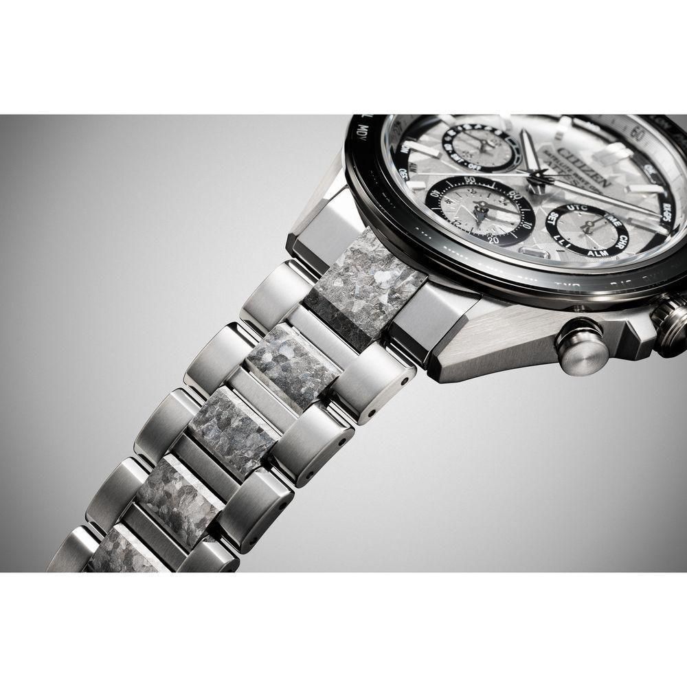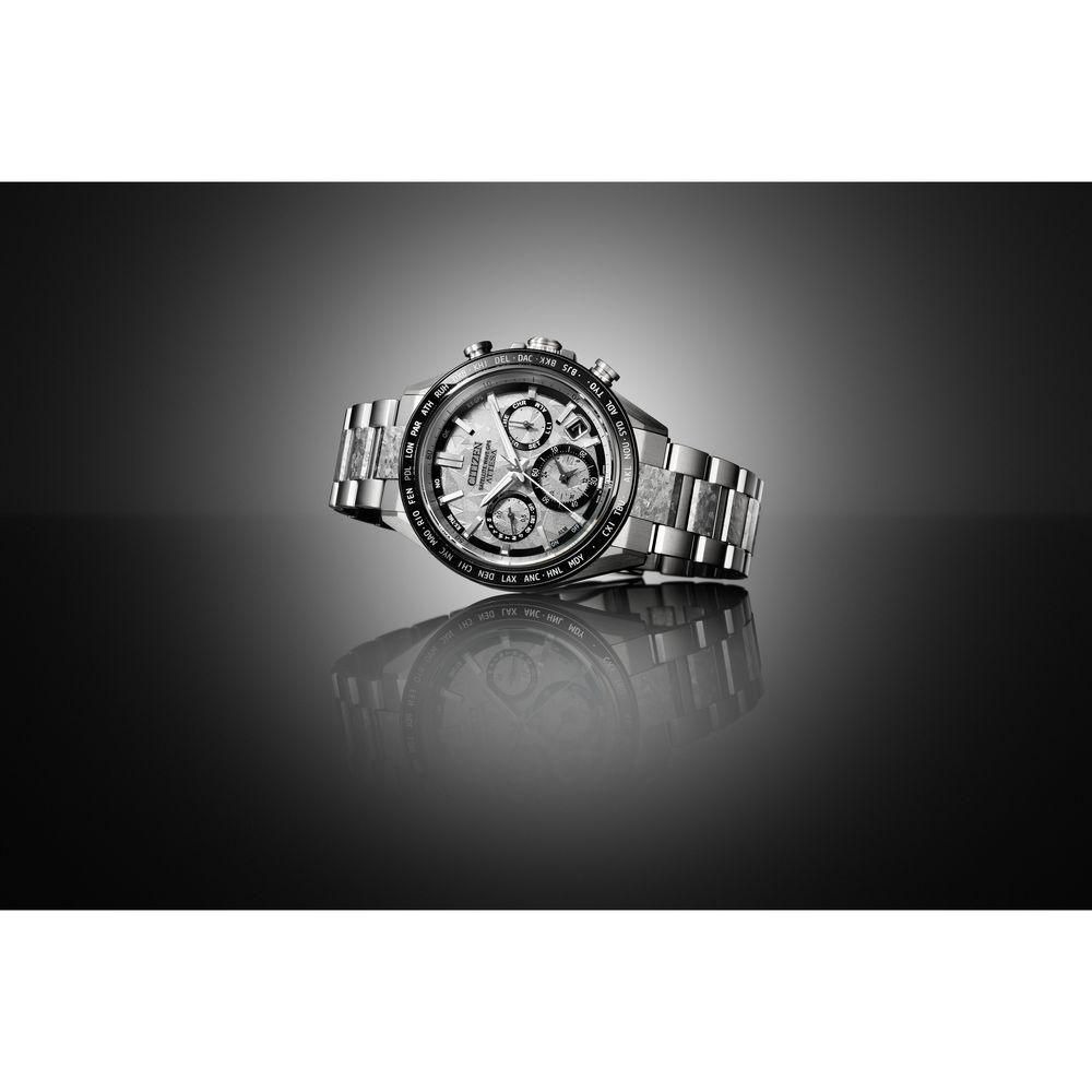 シチズン独自の技術で開発した結晶チタニウムを中駒に採用。デュラテクトプラチナを重ねることで結晶模様がプラチナの輝きをまとい、存在感を放ちます。シルバーの文字板は、結晶チタニウムをイメージしたデザインで、光に反射して表情を変えるメタリック塗装をプラス。見返しリングにも同様にメタリック塗装を施すことで、文字板や外装との一体感を演出しました。