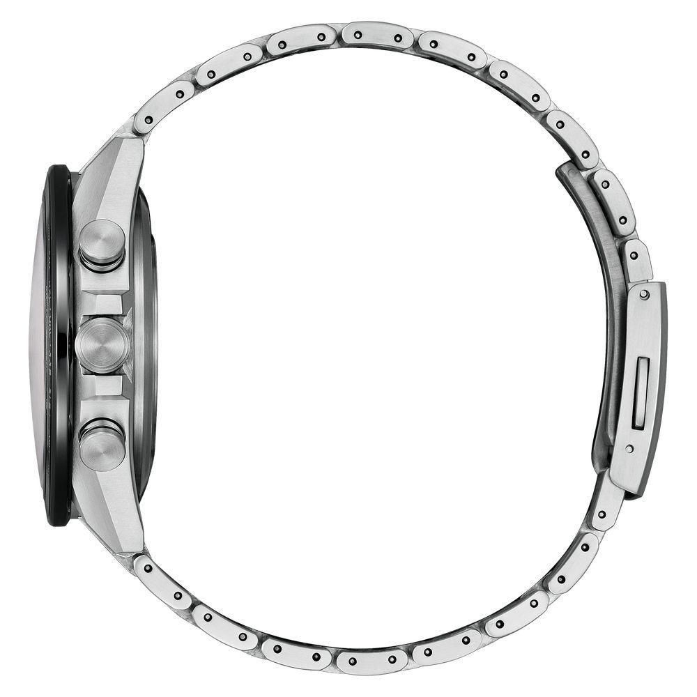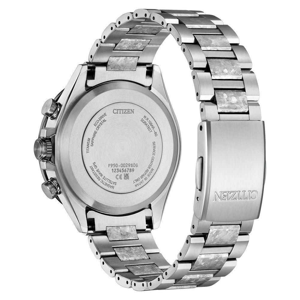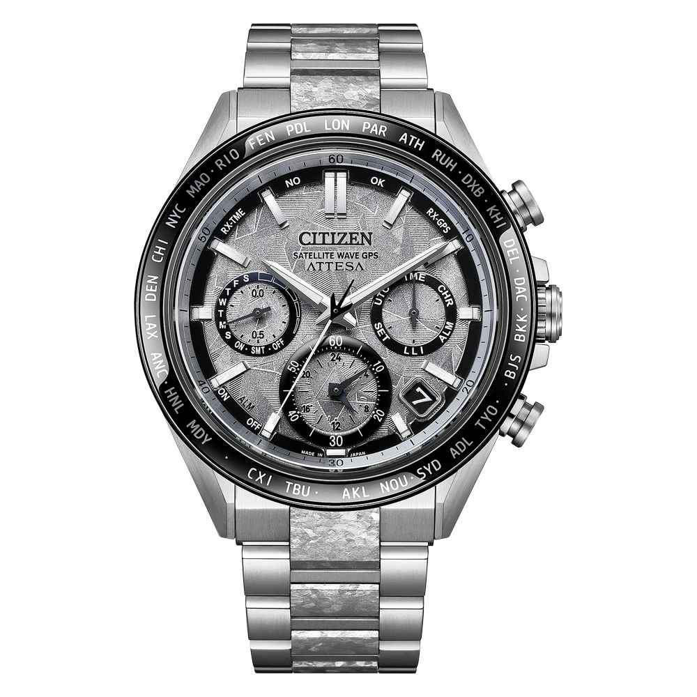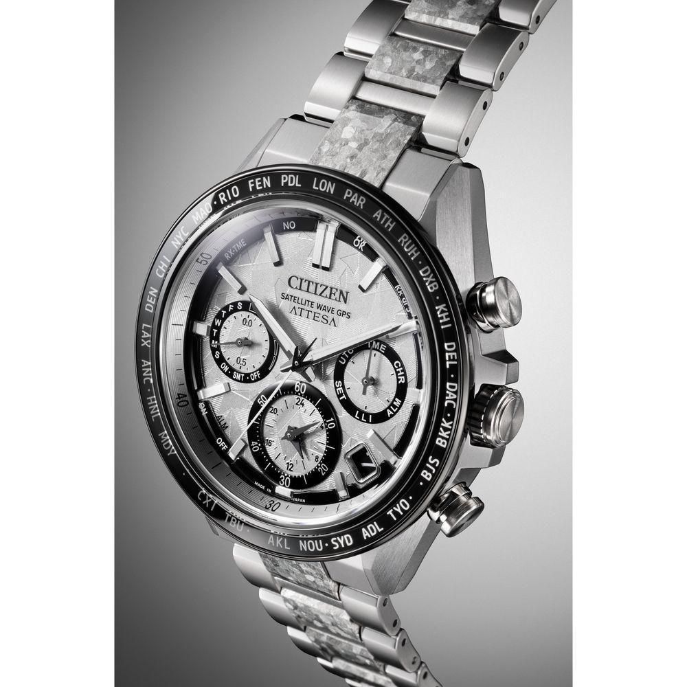 シチズン独自の技術で開発した結晶チタニウムを中駒に採用。デュラテクトプラチナを重ねることで結晶模様がプラチナの輝きをまとい、存在感を放ちます。シルバーの文字板は、結晶チタニウムをイメージしたデザインで、光に反射して表情を変えるメタリック塗装をプラス。見返しリングにも同様にメタリック塗装を施すことで、文字板や外装との一体感を演出しました。