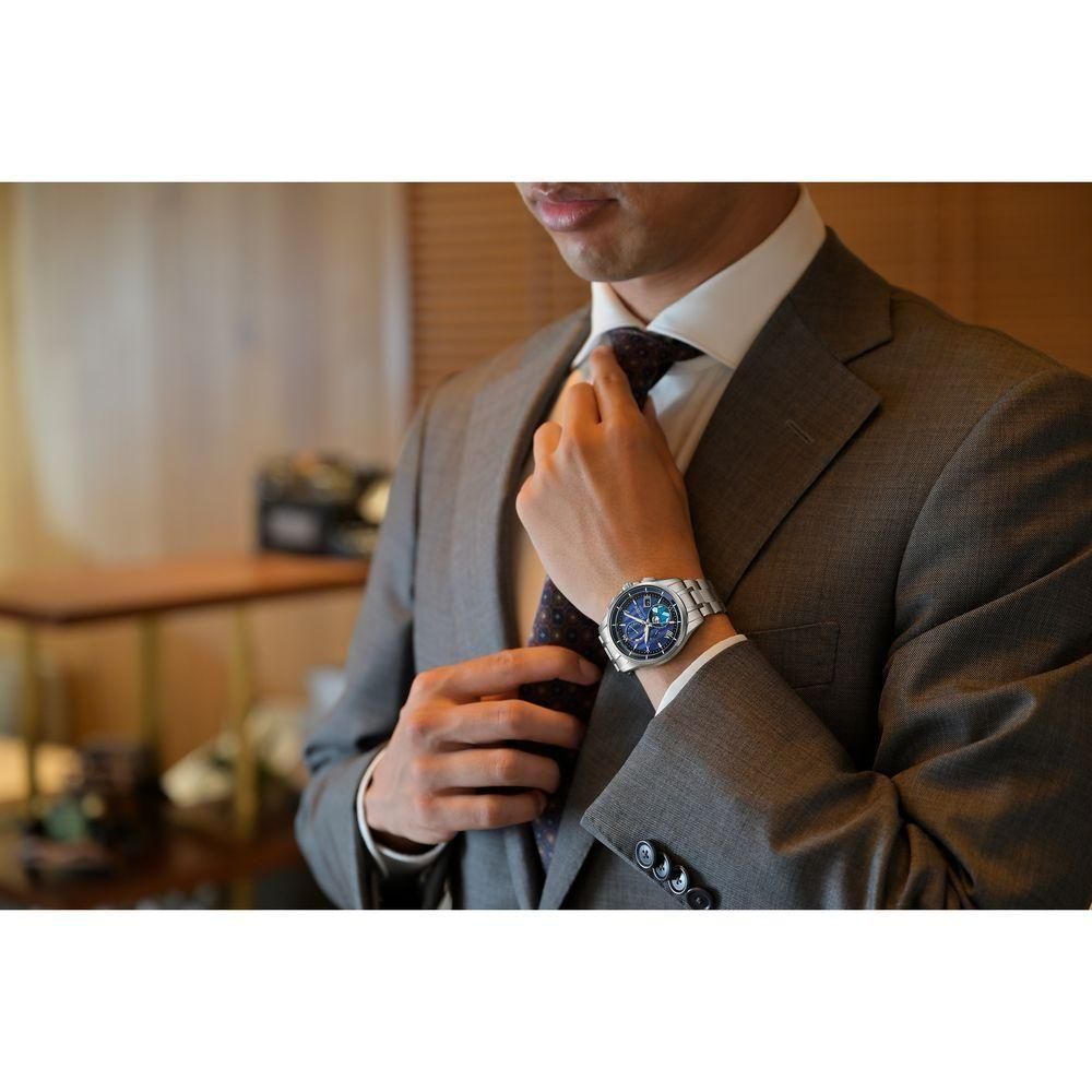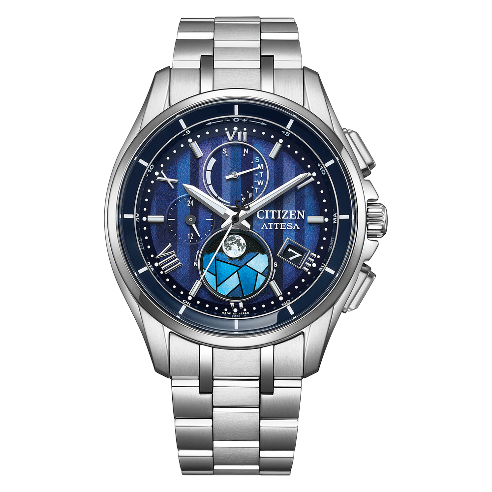 月齢自動計算機能「ルナプログラム」搭載モデルを限定仕様にアレンジ。デュラテクトプラチナのケースとバンドが、荘厳で神聖な印象を醸し出します。縦のブルーグラデーションで教会に降り注ぐさまざまな光を描いた文字板に、ローマ数字とバーインデックスを組み合わせたエレガントなデザインです。ムーンフェイズの月齢板を覆うエリアには半透明の印刷を施した白蝶貝を使い、美しく光るステンドグラスを表現。まるでステンドグラス越しの夜空を見上げるように、今宵の月の満ち欠けを確認できます。