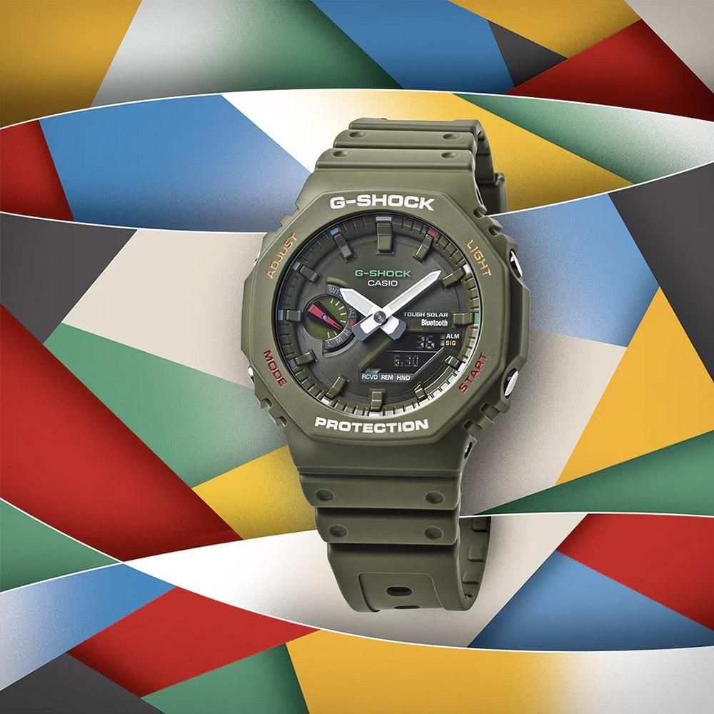 1983年の発売以来、飽くなき強さを求めて進化を続けるタフネスウオッチG-SHOCKから、フェスやイベントの華やかな雰囲気を差し色に使用した、Multi color accentsシリーズです。スマートフォンリンクとタフソーラーを搭載。カーボンコアガード構造と組み合わせることで、従来モデルのサイズ感をキープしています。ベースカラーはワントーンでまとめ、ベゼルの文字埋め、インデックス、9時側の小針などに赤・青・黄・緑といった原色を使うことで落ち着いた中にもにぎやかなイメージのモデルに仕上げました。カジュアルシーンから屋外のフェスなどでも幅広く活用できるモデルです。