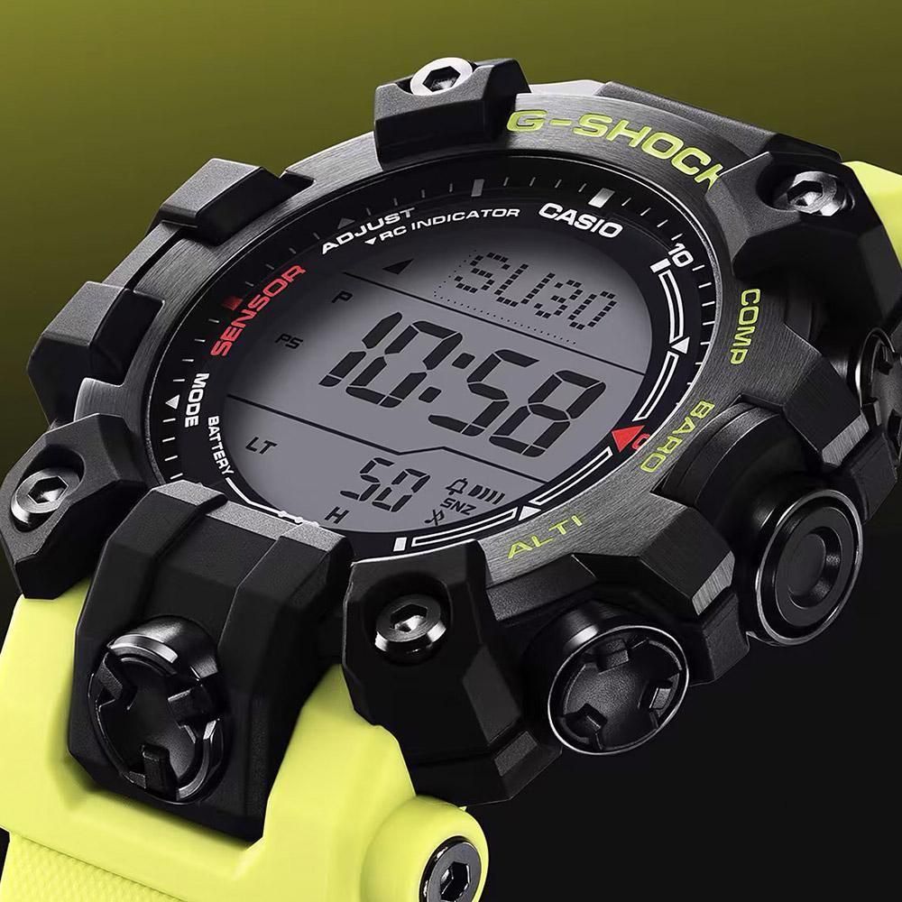 過酷な環境下での活動を支えるG-SHOCK MASTER OF Gシリーズ。タフネスを象徴するブラックボディにコーションカラーのイエローをバンドに合わせました。救助現場などで過酷なミッションに挑むプロフェッショナルの世界観を表現しています。耐衝撃構造に加え、防塵・防泥構造に、電波ソーラーとトリプルセンサーを搭載。方位表示の視認性を高めたデュプレックスLCDの採用により、デジタルコンパスの実用性を高めました。さらに、ベゼルパーツにステンレス素材を採用。ブラックIP処理で精悍なデザインに仕上げています。厳しい環境下でも、すばやい判断および的確な行動をサポートするタフネスウオッチです。
