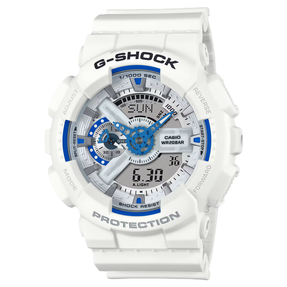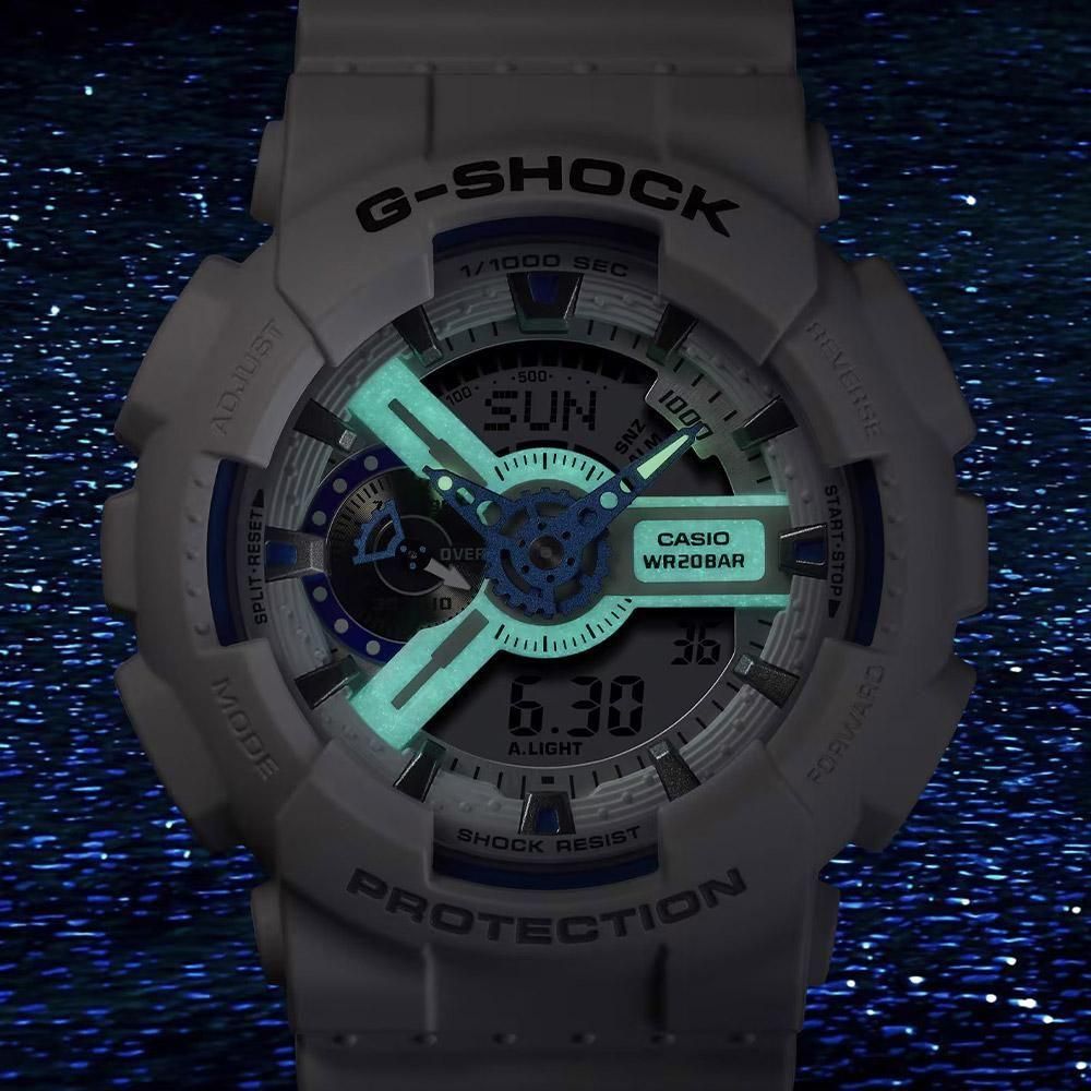 1983年の発売以来、飽くなき強さを求めて進化を続けるタフネスウオッチG-SHOCKから、人間の潜在能力を暗闇で光る蓄光パーツで表現した、HIDDEN GLOW SERIESです。夏の海をイメージしたホワイト&ブルーのカラーリング、夜光虫が放つ幻想的な光を表現したブルー蓄光フェイスを備え、昼と夜で異なる表情を見せるビーチの情景を表現しました。特徴的なダイアルデザインの個性を色と光で引き立てます。カジュアルスタイルからワークスタイルまでアクセントになるクールなデザインです。