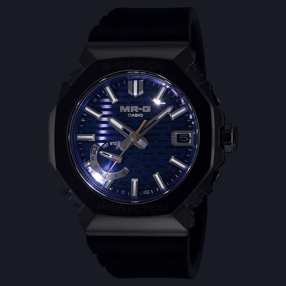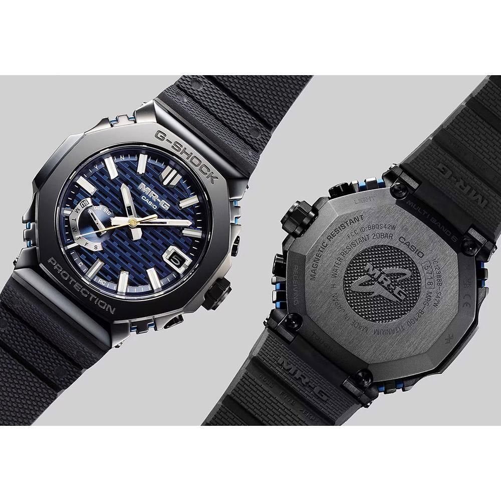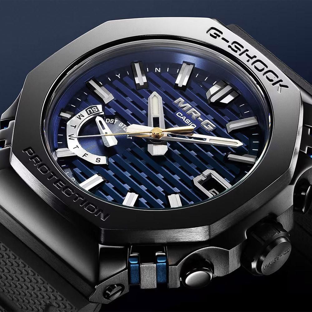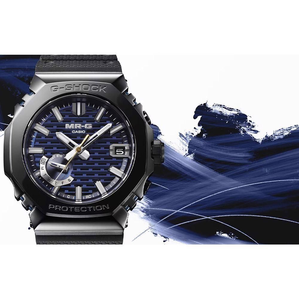 G-SHOCKの最上級ラインである「MR-G」シリーズ。MRG-B2100は、G-SHOCKの薄型モデル2100シリーズにこだわりの金属素材を使い丹念な仕上げを施してつくりあげたMR-Gです。複雑な形状のベゼルを27個の部品で構成することで、パーツごとに細部まで研磨を施せるようになり、より高い質感に仕上げることができました。ベゼルトップには純チタンの約4倍の硬度を誇り、プラチナと同等の輝きを持つといわれる「COBARION(コバリオン)」を採用しています。デザインは水墨画や書に用いられる青墨をイメージ。ダイアルにブルーの蒸着加工を施してゴールドカラーの秒針を合わせています。ベゼルにはダイアモンドライクカーボンのブラックをベースに、四隅のパーツにブルーIPコーティングを施しました。