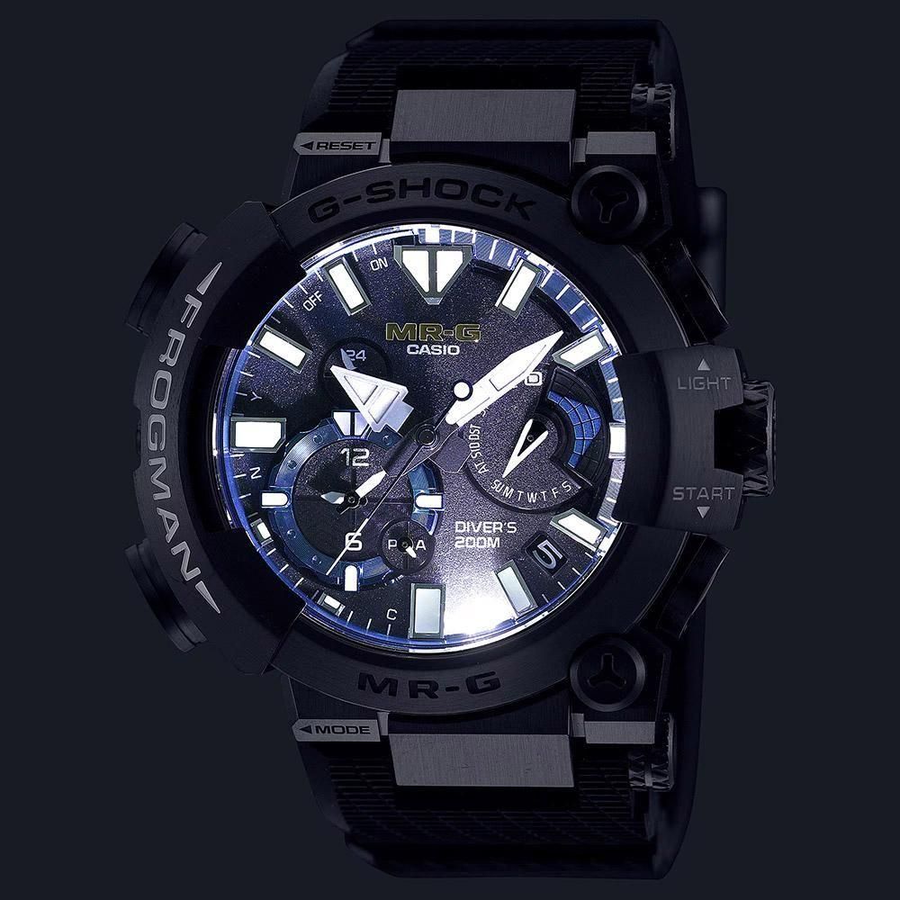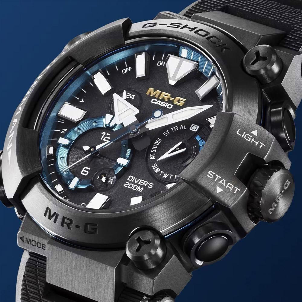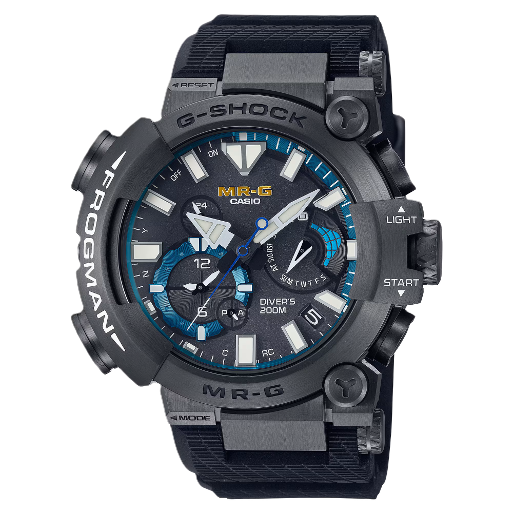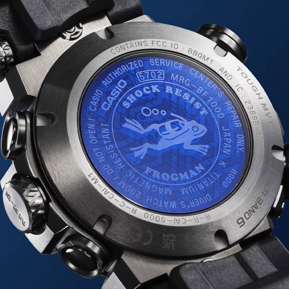 ISO規格200m潜水用防水機能を持つダイバーズウオッチ「FROGMAN(フロッグマン)」にチタン外装を採用し、丹念な仕上げを施してつくりあげたMR-Gです。左右非対称の複雑な形状をMR-Gとしてチタンで製品化するにあたり、パーツを分割して構成し細部まで研磨を施すことで、より高い質感に仕上げることができました。フロッグマンの持つ高い防水性を確保するOリングや耐衝撃性を保つ緩衝体を含めると、70を超える外装部品で組み上げられています。スクリューバックの裏蓋には、サファイアクリスタルにブルーの蒸着を施しFROGMANのアイコンであるカエルのキャラクターを美しく描きました。