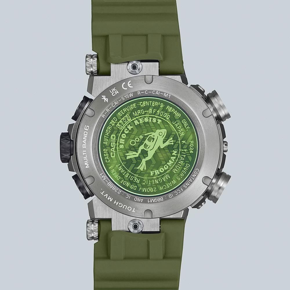 耐久性が高く着け心地の良いフッ素ラバー製のデュラソフトバンドを採用し、美錠と遊環には硬度の高い64チタン合金を使用。世界最大のカエル「ゴライアスガエル」をモチーフに、その体色をグリーンカラーで表現し、視認性の高いオレンジの差し色を施して大人の冒険心を刺激するデザインに仕上げています。裏蓋にはサファイアクリスタルにグリーンの蒸着を施しFROGMANのアイコンであるカエルのキャラクターを美しく描きました。