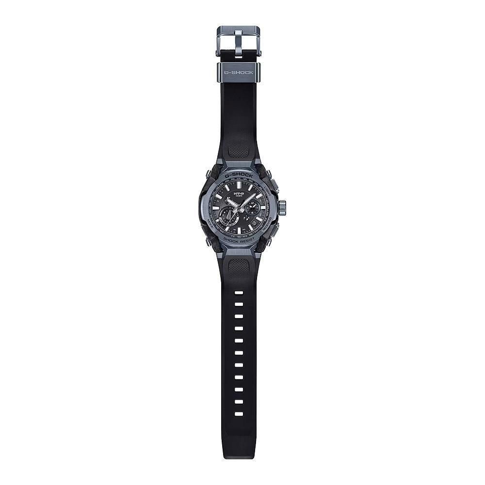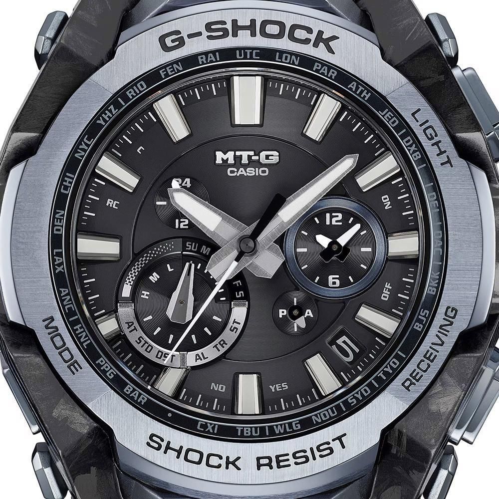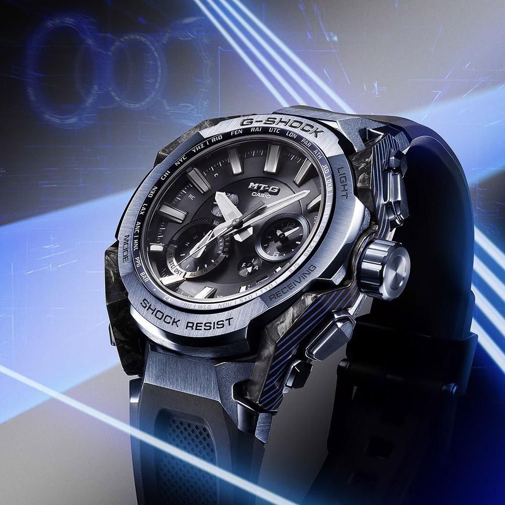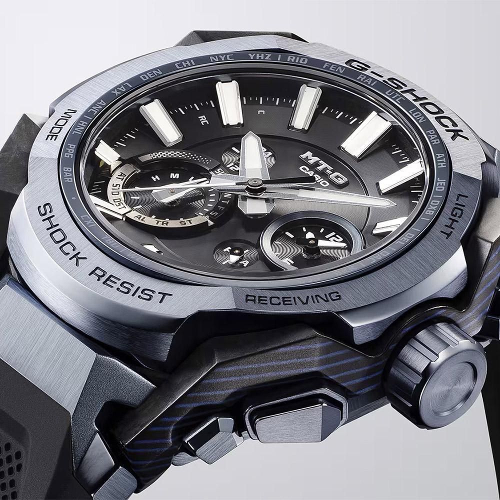 G-SHOCKの起源である樹脂素材とメタル素材を融合して、革新的な構造美を追求するMT-Gシリーズ。MTG-B4000は、蓄積された耐衝撃データを活用したAIによって開発されたデュアルコアガード構造と、カーボンとステンレススチールの異素材融合フレームを採用しています。カーボン積層フレームは、シート状のカーボンとグラスファイバーを積層した母材を立体状に削り出し複雑造形のフレームを成形。ベゼルのステンレススチールパーツは内側と外側で2体ベゼルを採用。ヘアライン仕上げとミラー仕上げで部位ごとに磨き分け、美しく仕上げました。また、ベゼルなどのステンレススチールパーツにブルーグレーのIP加工を施しています。裏蓋は、粉末状の金属を射出成形するMIM(メタルインジェクションモールディング)成形により立体的に成形され、ケースを保護しています。機能面ではBluetooth? 通信機能により専用アプリ「CASIO WATCHES」と接続し時刻情報を取得。マルチバンド6やタフソーラー、高輝度なLEDライトも搭載し、実用的な機能を備えています。