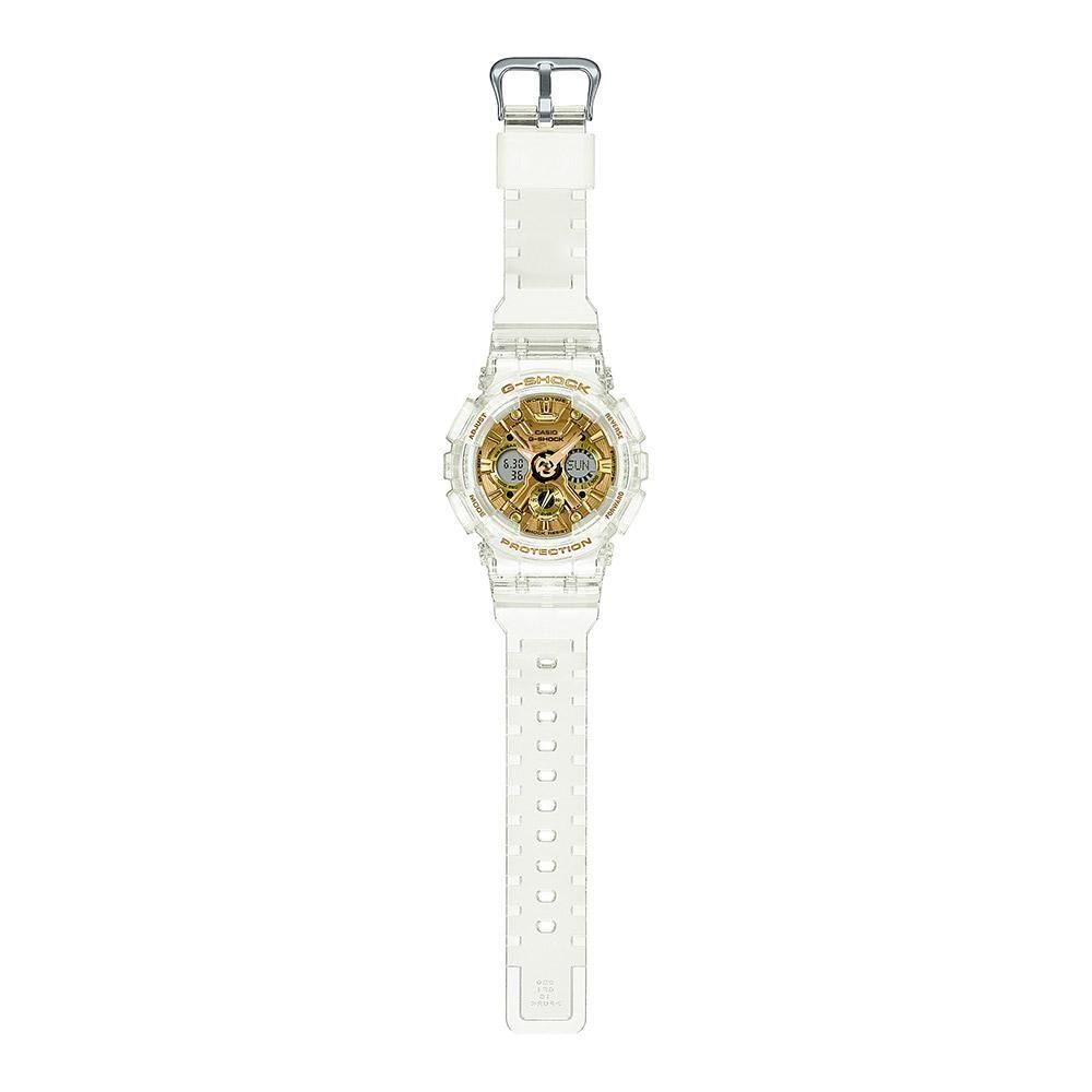 飽くなき強さを求めて進化を続けるタフネスウオッチG-SHOCK。夏らしい爽やかさと華やかさのあるモデルです。ベースモデルは人気のGMA-S120。クリアスケルトンのバンドにゴールドの蒸着文字板を組み合わせ、アクセサリー感覚でスタイリングしやすいデザインに仕上げました。