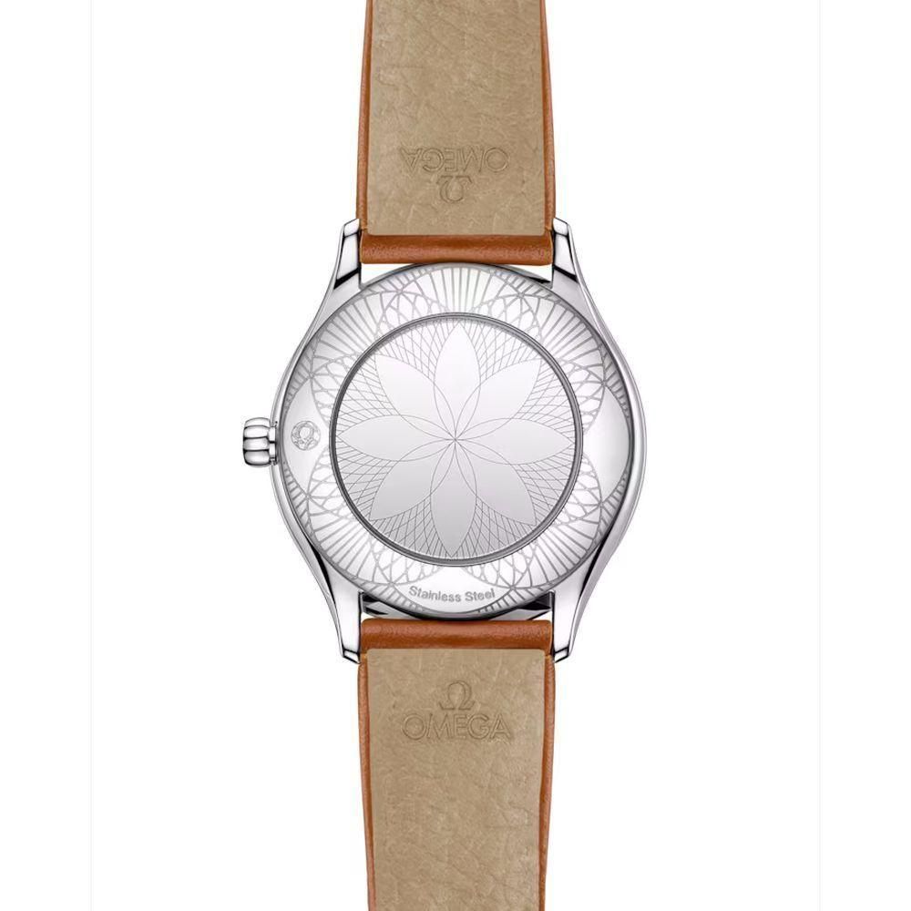 ミニ トレゾアは、オメガの最も現代的なレディス コレクションをより洗練させたモデルです。コンパクトなサイズと大胆なスタイルが目をひき、手元を彩ります。ステンレススティールのこのモデルは、26mmのケースの両サイドにダイヤモンドがエレガントな曲線を描くように敷き詰められています。リュウズには赤いフラワーモチーフがあしらわれ、一粒のダイヤモンドがセットされています。オフホワイトの「グラン・フー」エナメルで作られたドーム型のダイアルには、転写されたグレーのローマ数字のインデックスが配されています。「トレゾア」バックル付きの、ノヴァナッパ製ストラップが付属しています。オメガ キャリバー4061搭載。特殊な鏡面仕上げのケースバックには、「Her Time」エキシビションのシンボルとして使われているフラワーパターンがあしらわれています。